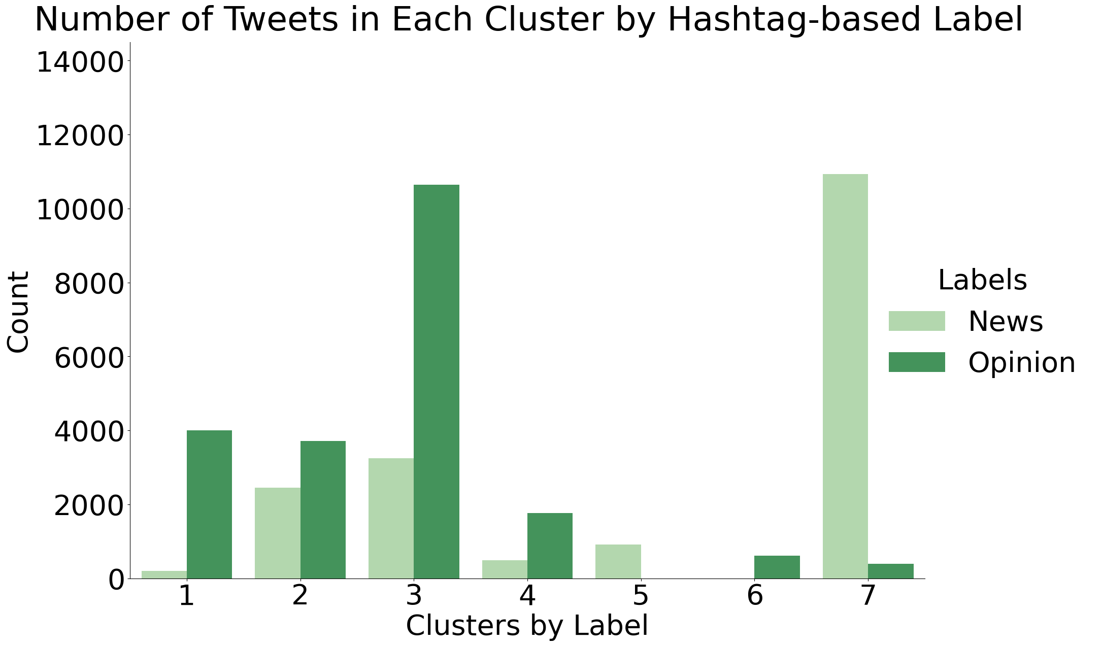 Perhaps one of the most insightful observatios we can make about the clusters is how they compare to the hashtag-based labels that we used for the Naïve Bayes algorithm. Do the clusters act as subcategories within the scope of news vs opinion tweets? Or is there more overlap?