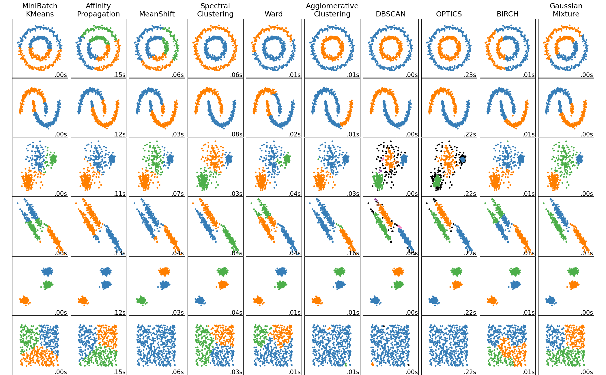 - Clustering algorithm performance by dataset shape chart is taken from Scikit Learn's website.