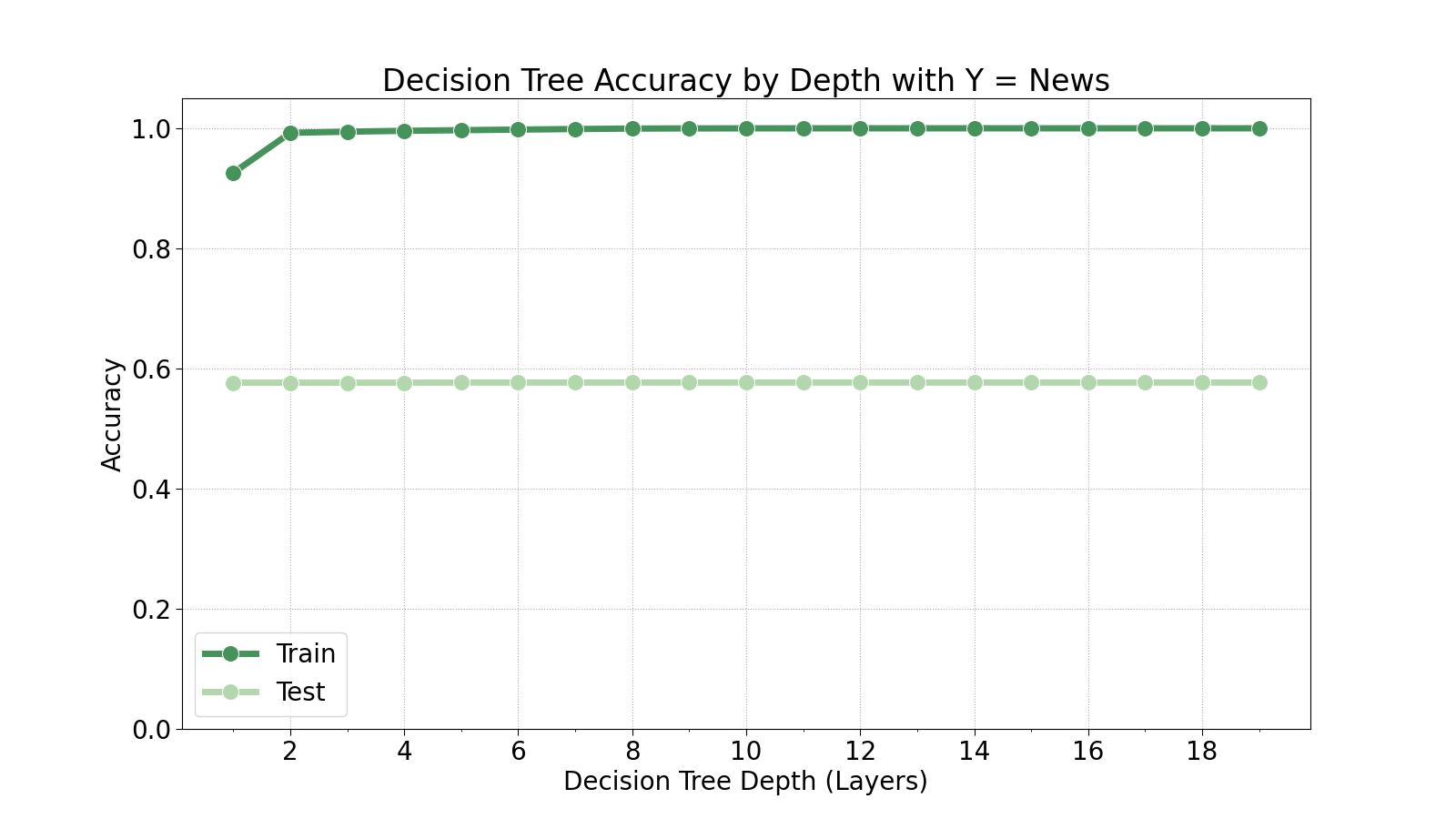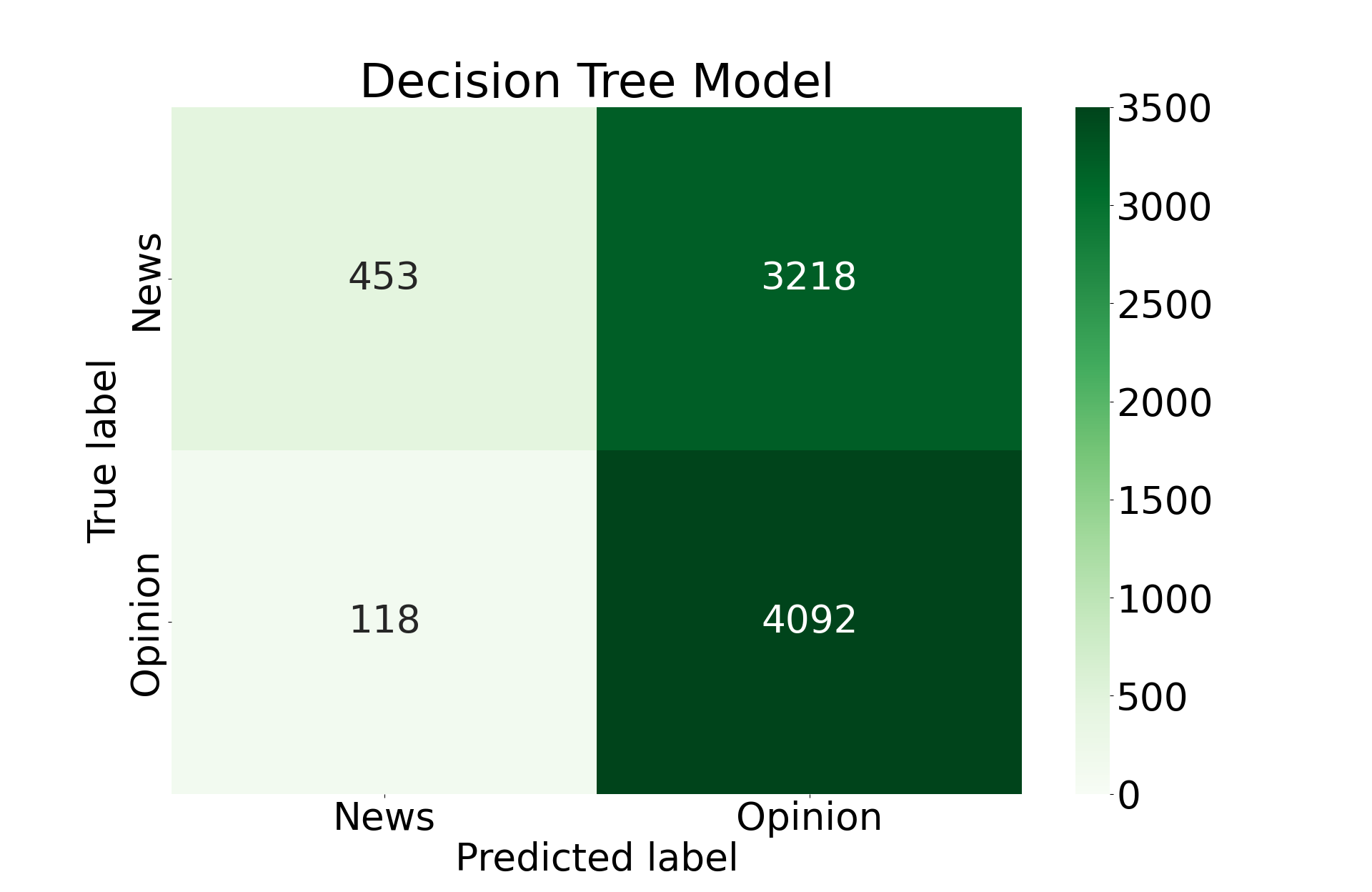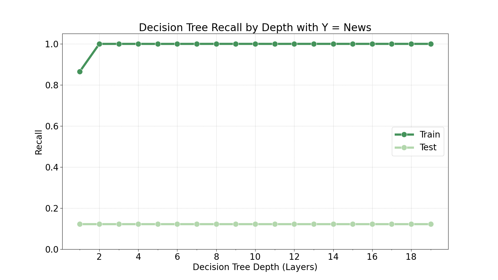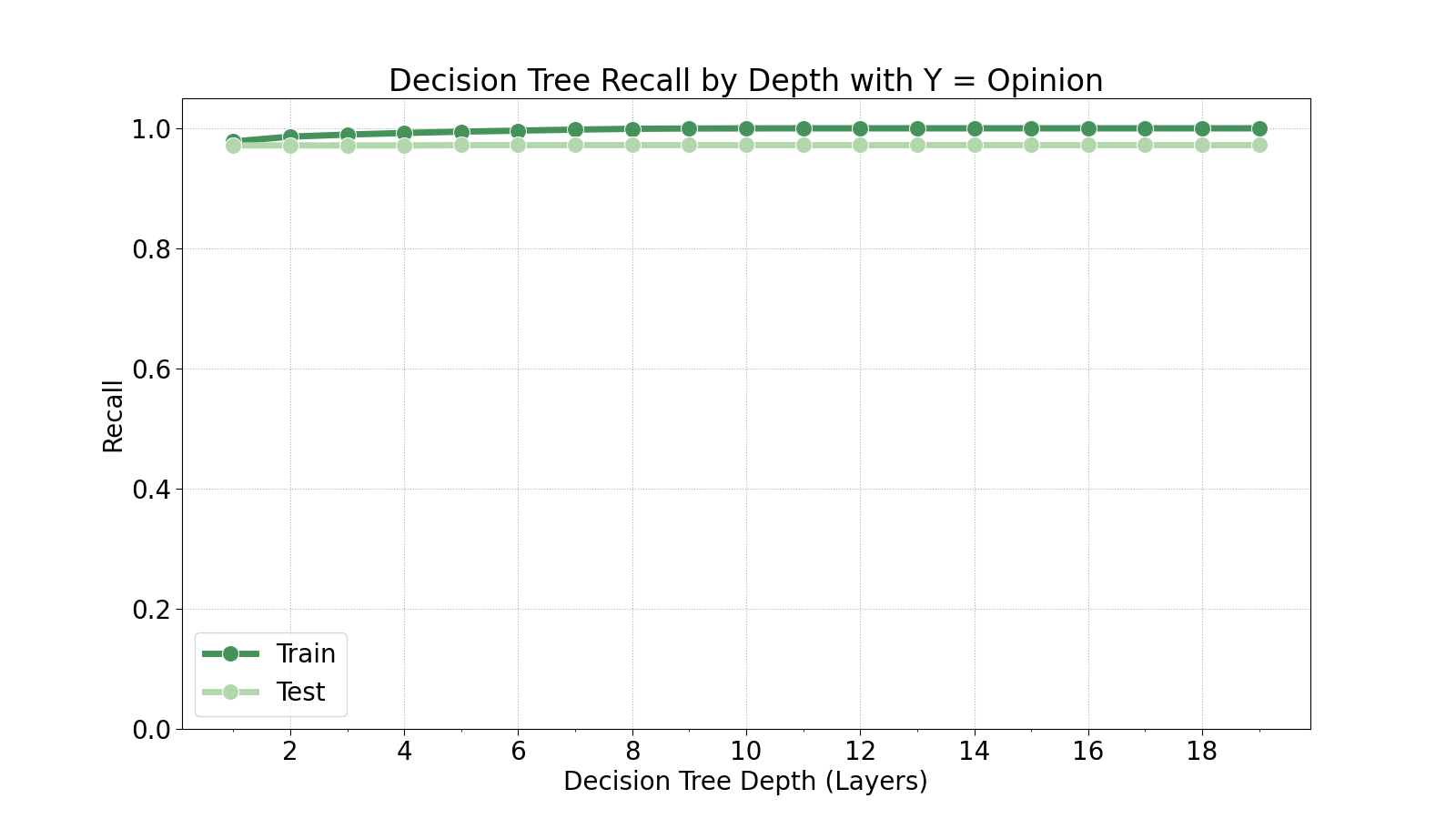 As we can see in the plots above, the test set generally does not improve with deeper decision trees. There is a slight improvement in recall of the opinion class at a depth of 5, but that is the only indication of improvement. Therefore, we will train the model at a maximum depth of 5.