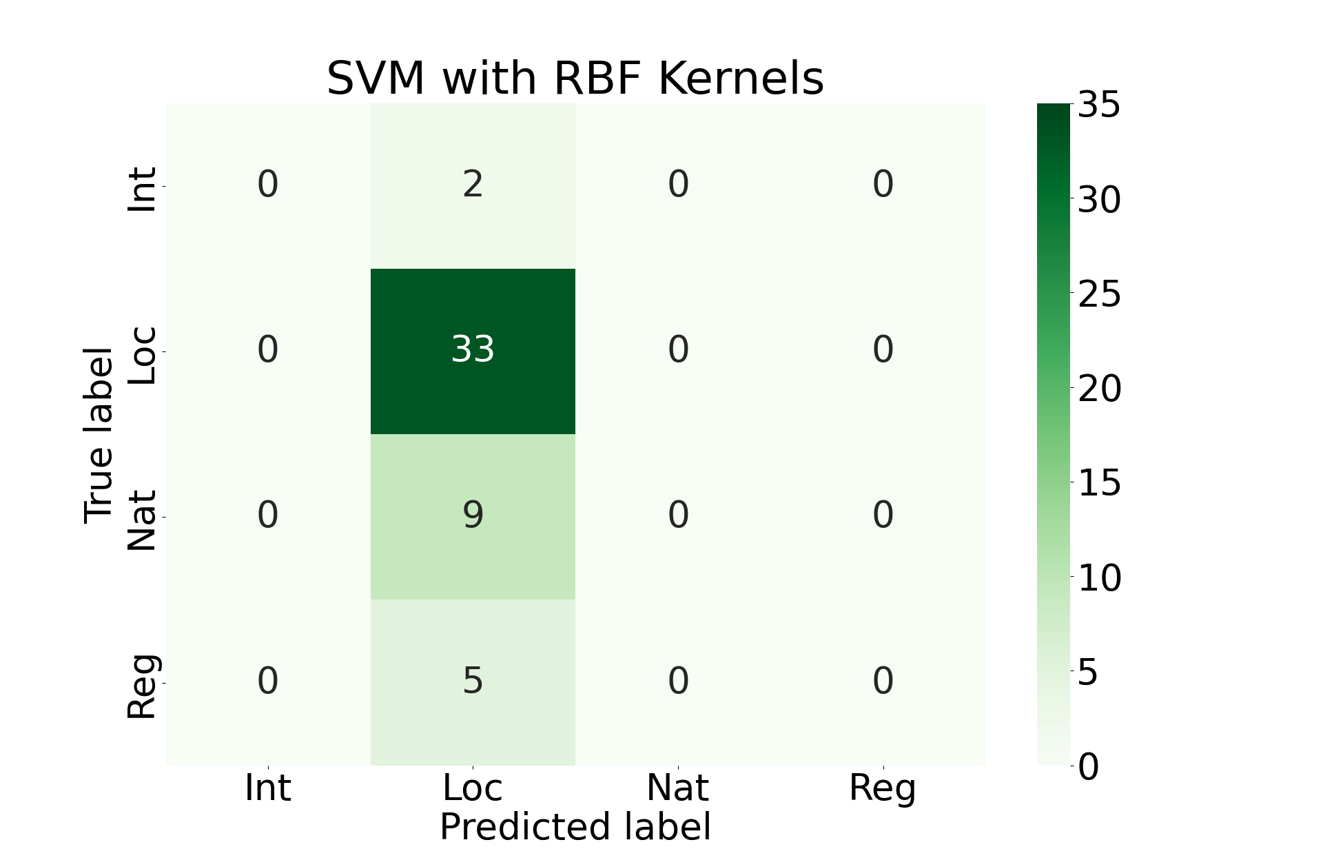 Unfortunately, all of these approaches perform roughly the same. They primarily favor prediction that the incident was locally covered. This is almost certainly due to the imbalance of classes that we see above.